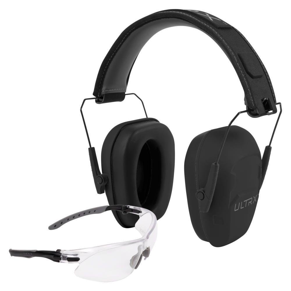 ULTRX Shield Ear and Eye Protection Combo gives you the best of both worlds protective eyewear and hearing protection in one package. Provided in this duo is one pair of safety glasses and a pair of earmuffs. Crafted with high-impact polycarbonate our lenses provide superior durability and protection for your eyes. The lens is equipped with an anti-fog coating ensuring clear vision even in challenging conditions. Providing premium comfort the headband is provided with extra padding ensuring a comfortable fit during prolonged use. Whether you’re at the shooting range working on a construction site ULTRX has you covered in protecting your eyes and ears no matter what the circumstance are.