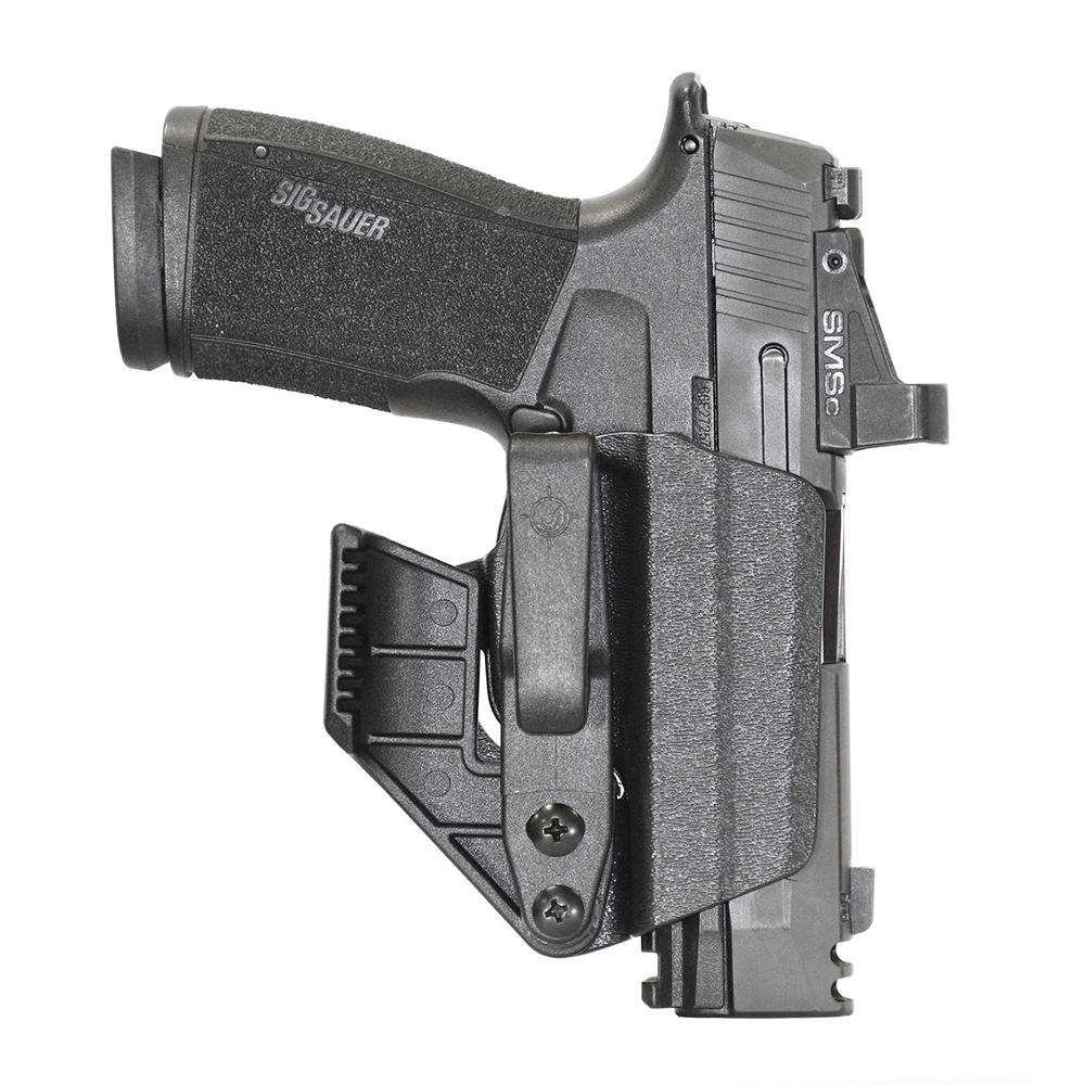 Mission First Tactical's Minimalist Holster is a low profile holster with all the performance and reliability of a full-size holster. For use Inside the Waistband (IWB) in the Appendix and 5:00 positions. Both right & left-hand positioning is accomplished with the removal of the claw and use of provided spacer. The claw for right handed shooters keeps the heel of the firearm pressed into your side minimizing it?s print. The famous ?audible click? with added side retention makes each draw smooth and secure ideal for Concealed Carry. Each holster is handmade to precise tolerances for each model of handgun using the most advanced techniques and materials for an all-day comfortable carry. Holsters include a Tuckable Belt Clip that accommodates a 1-1 ½ belt. Or remove the clip and claw and add a static-line tether keeping the trigger secure while using the firearm inside a night stand safe purse briefcase vehicle console etc.