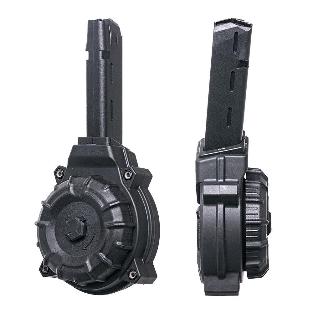 With its cutting-edge technology the Glock 19 drum mag incorporates a straightforward loading mechanism designed to reduce tension from its intrinsic spring system. This 9mm Glock drum further enhances user experience with its transparent back panel enabling shooters to gauge their ammo status swiftly. To assist in cleanliness and longevity it's effortlessly disassembled and a notable feature is its unique bolt-securing system. So if you want to elevate your Glock 17 or Glock 19 with drum capacity this 50-round Glock mag is your ultimate companion ensuring reliability shot after shot.