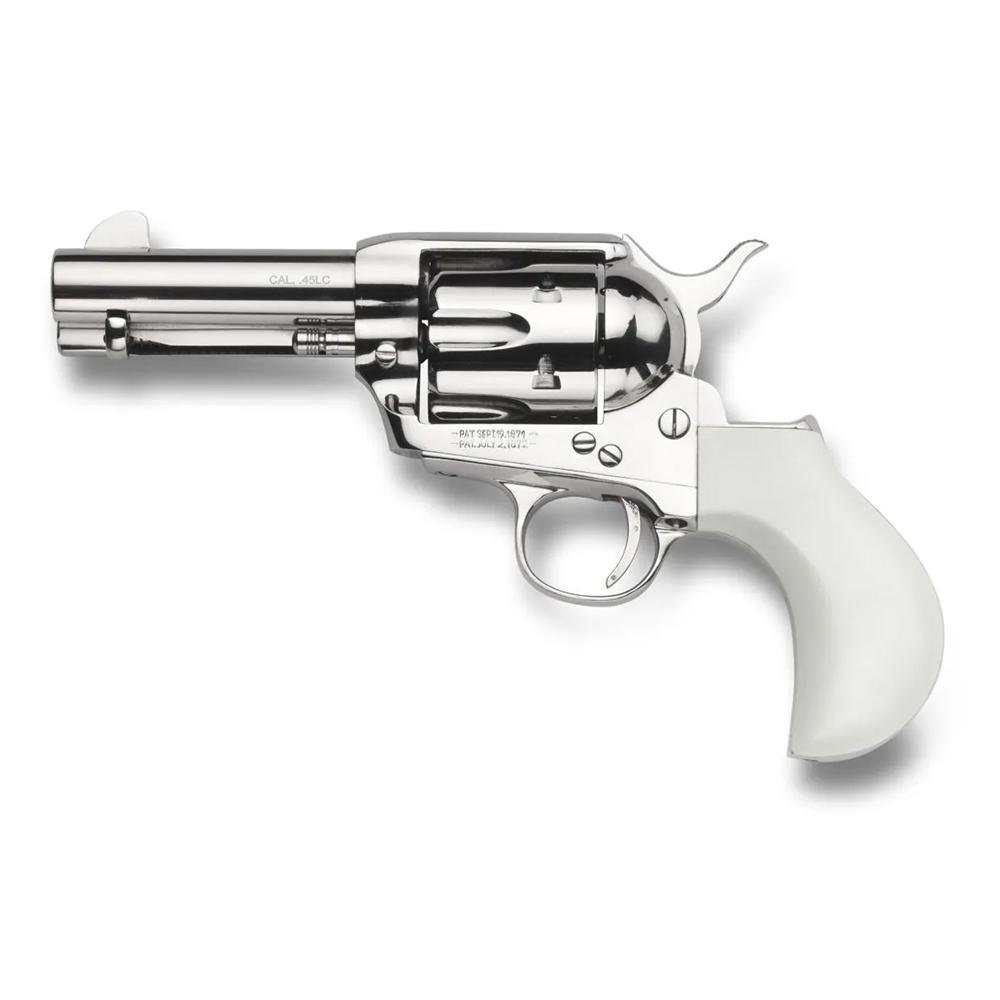 The 1873 Single Action Flattop Birdshead Ivory model is the perfect "barbeque gun" to show off! It combines the performance of a full size revolver with a compact barrel length. This model features a steel new model frame classic nickel plated finish and a one-piece polymer ivory flattop birdshead grip.